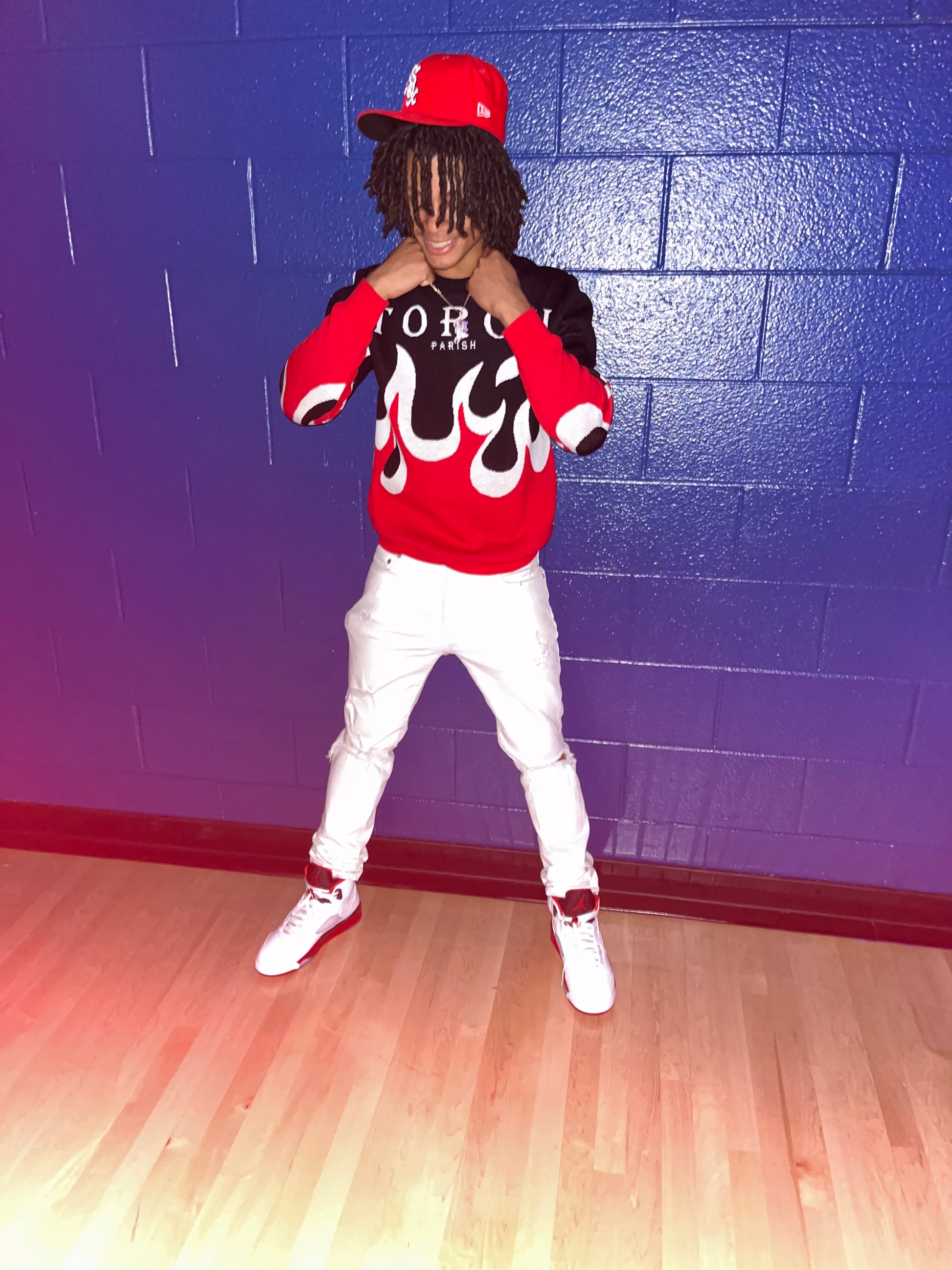 - red white and black sweater